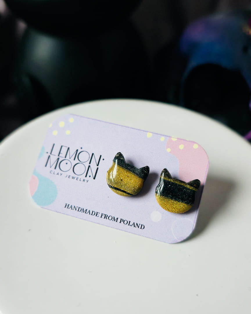 Urocze, czarno-złote kolczyki w kształcie główki kota. Kolczyki zostały wykonane z glinki polimerowej. Kolczyki zostały pokryte żywicą dzięki czemu złote drobinki pięknie sie błyszczą. Zdjęcie nie oddaje ich uroku.