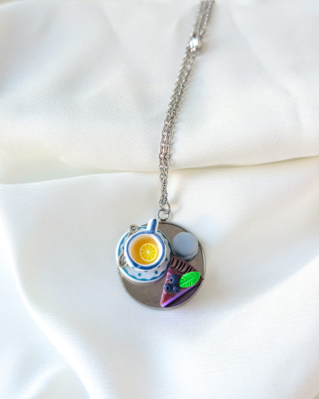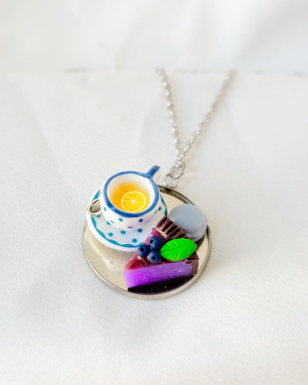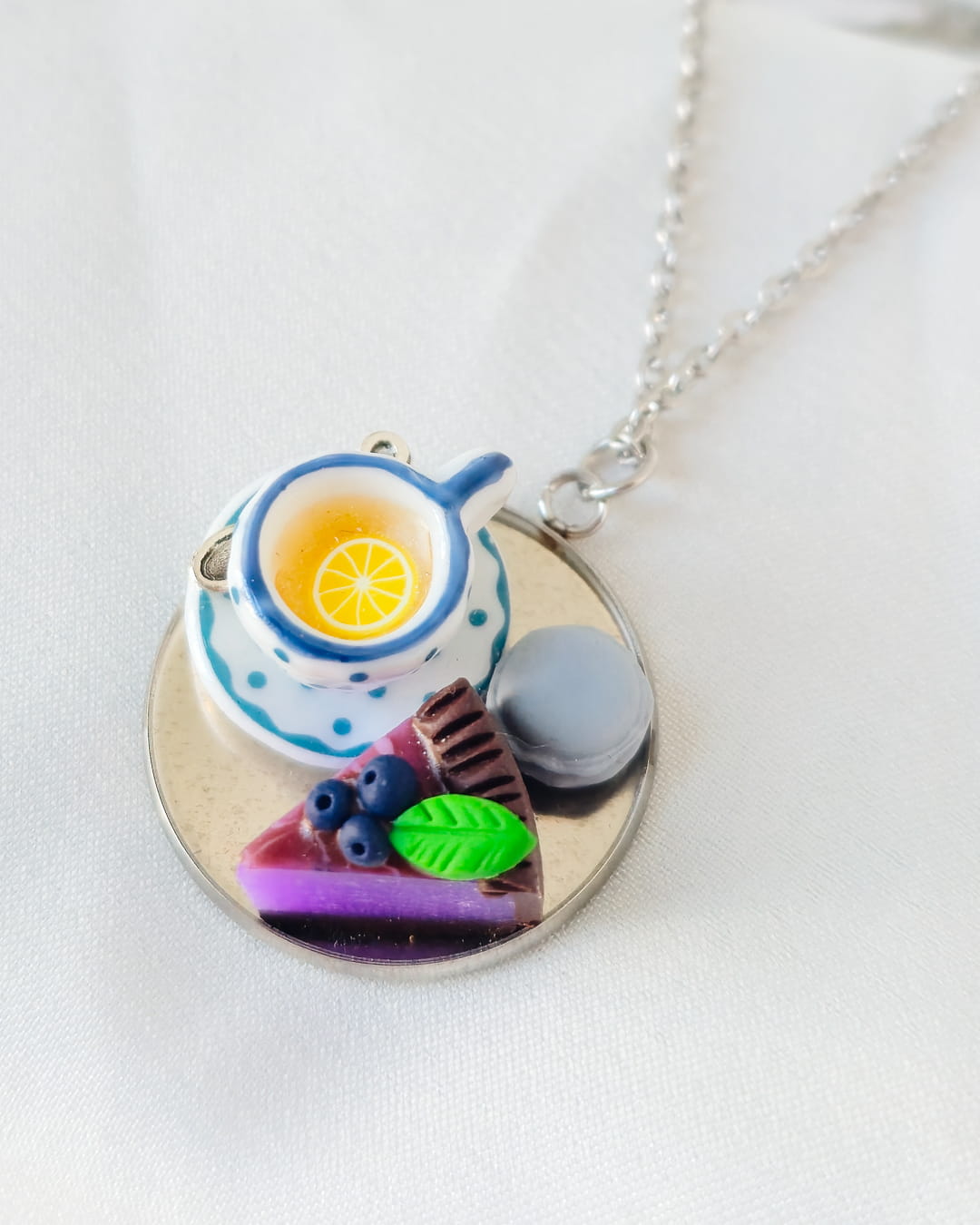 Naszyjnik filiżanka w kropki i tarta jagodowa